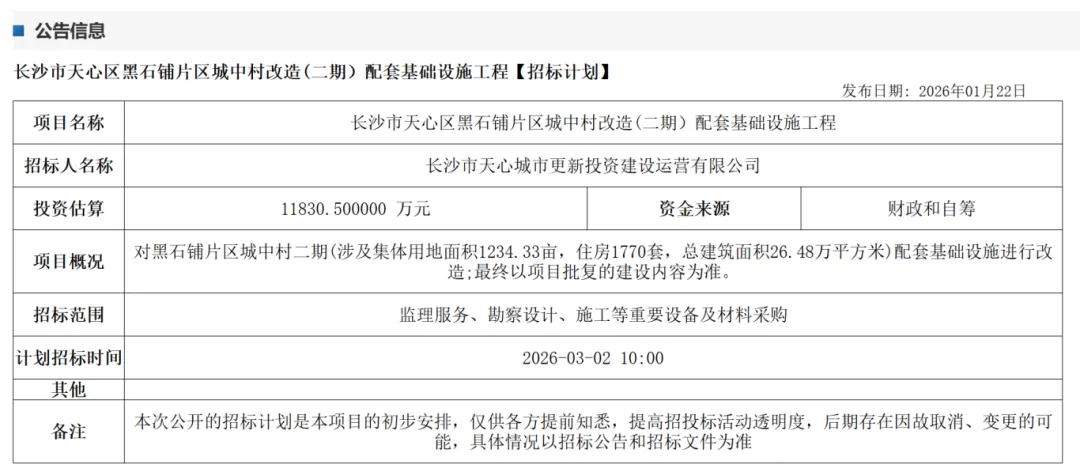 根据长沙公共资源交易中心1月22日发布的招标计划,黑石铺片区城中村改造(二期)配套基础设施工程投资估算达11830.5万元,计划于2026年3月2日正式招标。