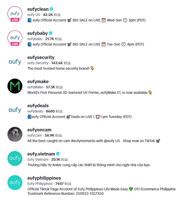 按照核心业务划分,有专注清洁领域的@eufyclean、专攻安防赛道的@eufysecurity;按照目标市场划分,还搭建了本土化账号,比如面向越南市场的@eufy.vietnam、针对菲律宾市场的@eufyphilippines。