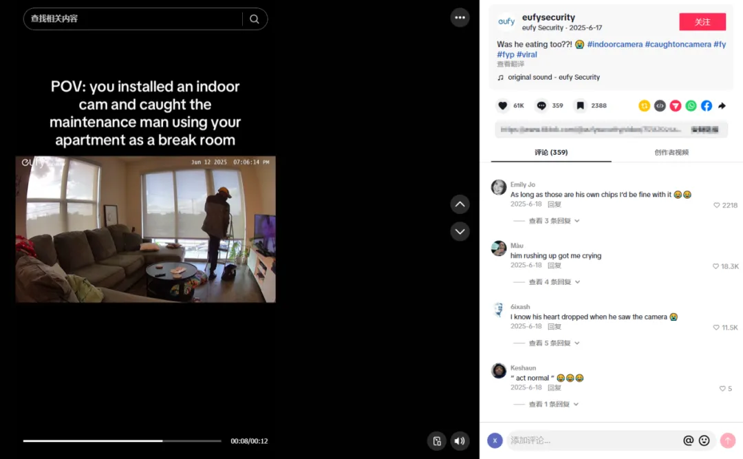 以其中一条爆款视频为例,这段视频以Eufy室内摄像头的第一视角呈现,记录了维修人员擅自将业主公寓当作休息区,看电视、食用薯片,直至发现摄像头拍摄后才开始工作的趣味场景。