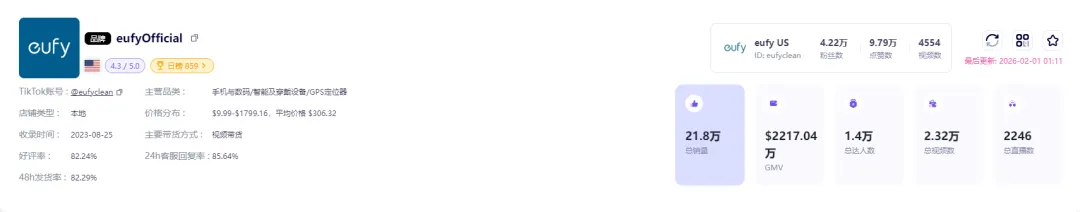 除了在自己的账号做好内容运营外,Eufy品牌在美国本土开设的TikTok小店eufyOfficial的表现也相当亮眼。