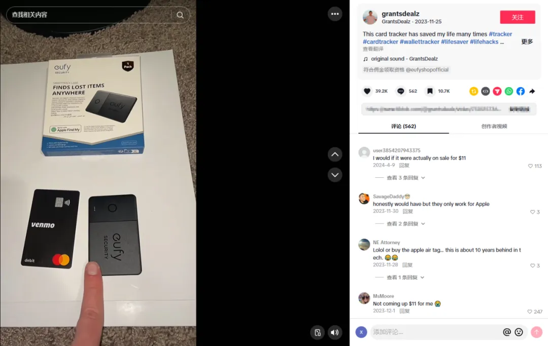 该视频聚焦Eufy的智能卡追踪器,完整呈现产品开箱与实操演示过程。依托达人清晰的讲解与直观的展示,让很多潜在用户了解到这款追踪器可以在任何地方找到丢失的智能卡片,并且兼容于苹果系统。