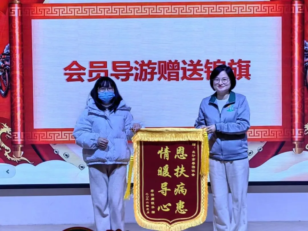会员导游周银华为长沙市导游协会授锦旗并发表讲话,感谢协会伸出援助之手,给她增加了战胜病魔的勇气和力量,让她感受到了长沙导游一家亲的温暖与牵挂。