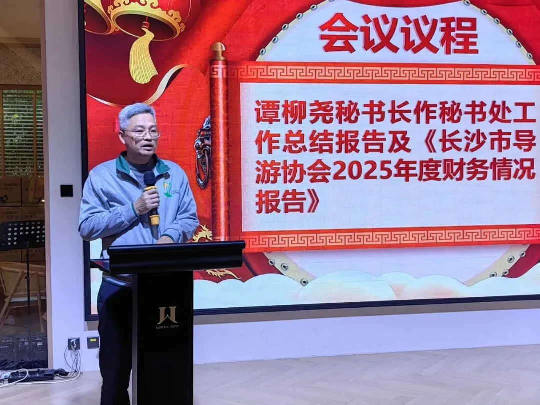 谭柳尧秘书长作秘书处工作总结报告及《长沙市导游协会2025年度财务情况报告》。