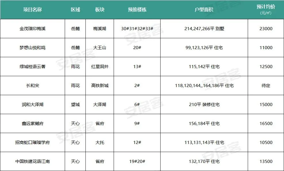 区域分布上,岳麓大王山、梅溪湖,雨花区红星洞井、高铁新城,天心省府,望城大泽湖,均有住宅入市。