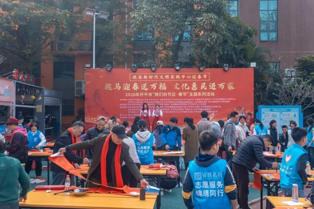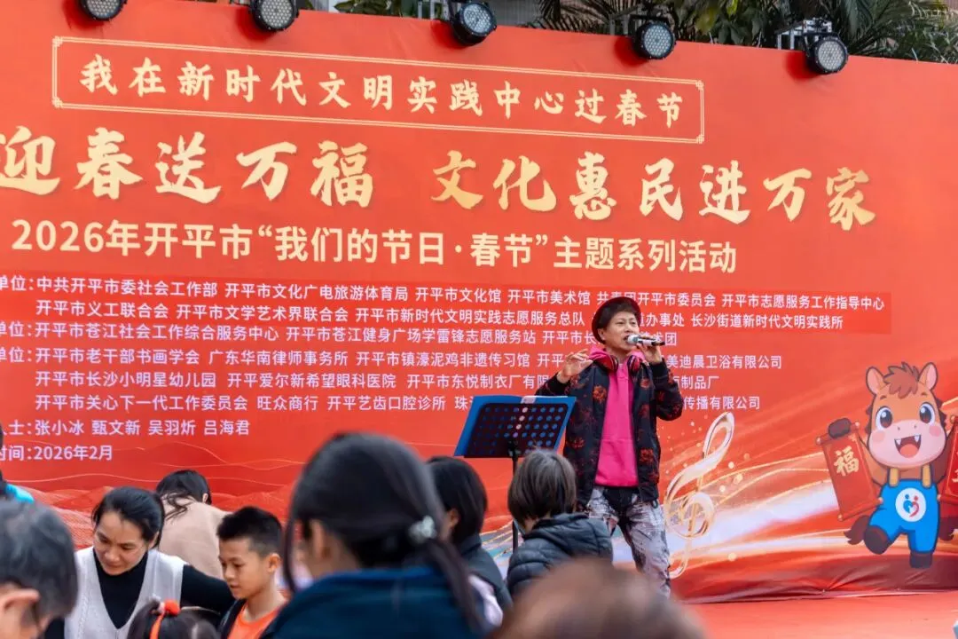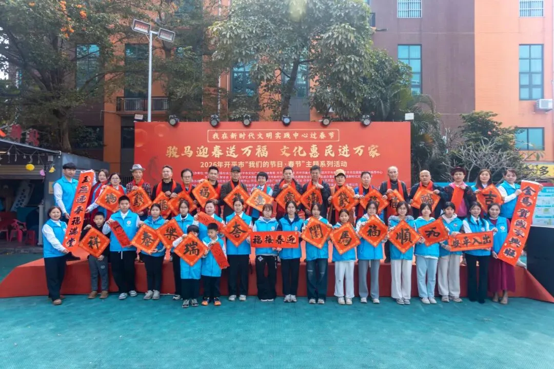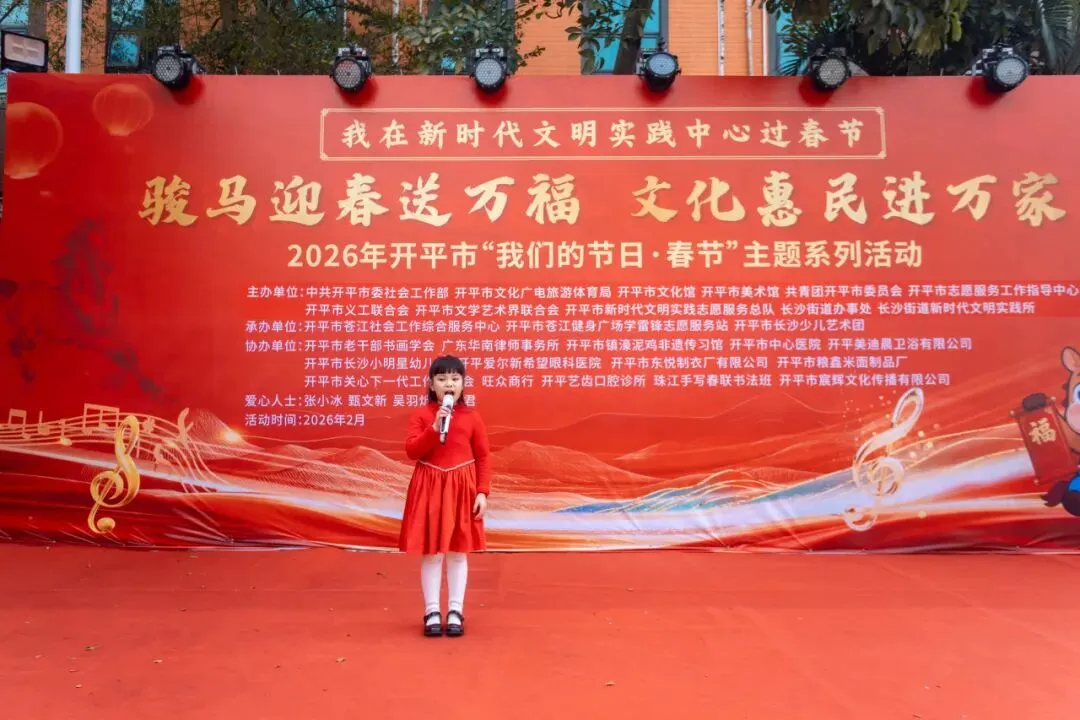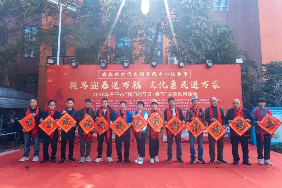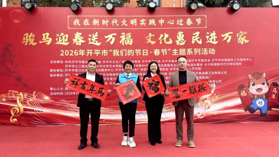 骏马迎春,福乐和鸣。2月1日上午,由开平市新时代文明实践志愿服务总队、中共开平市委社会工作部、长沙街道办事处、长沙街道新时代文明实践所等单位联合主办,苍江健身广场学雷锋志愿服务站承办的“我在新时代文明实践中心过春节——‘骏马迎春送万福 文化惠民进万家’”2026年开平市“我们的节日·春节”主题系列活动,在苍江健身广场圆满举行。长沙街道办事处副主任黄毅梨、党群服务中心主任李文海参加活动,与市民共赴一场融合笔墨丹青与雅乐清音的新春文化盛宴。