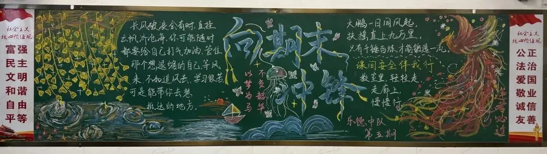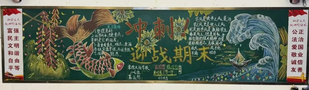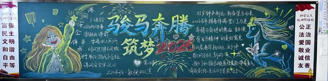 紧扣元旦节日氛围与期末德育总结节点,以文化浸润为抓手,按年级设定差异化黑板报主题,组织各班开展创作活动。各班师生凝心聚力、精心构思,将主题内涵、班级特色与审美创意融入版面设计,在笔墨勾勒、图文搭配中锤炼学生实践能力与审美素养,深化主题教育认知。
