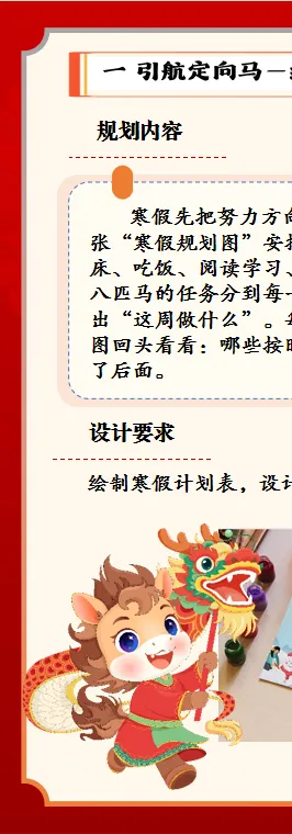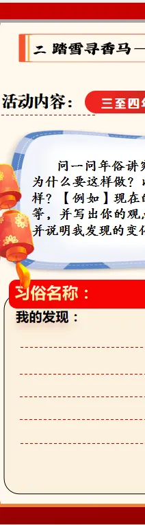 结合学生年龄特征、认知规律及时令特点,分年级分层设计寒假德育实践作业,实现“学段有侧重、人人能参与、实践有收获”。低年级聚焦生活自理与传统文化启蒙;中年级侧重劳动实践与品德践行;高年级围绕责任担当与素养提升。通过分层作业设计,推动德育工作从校园向家庭延伸、向生活渗透,确保假期育人不缺位、德育实效不打折。