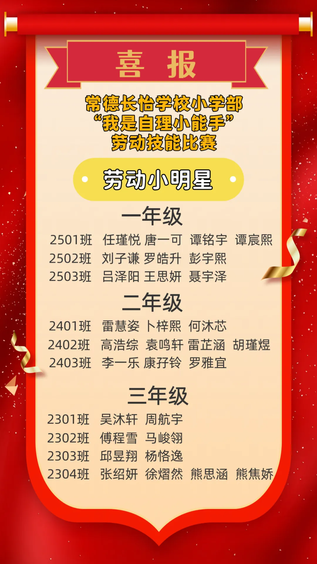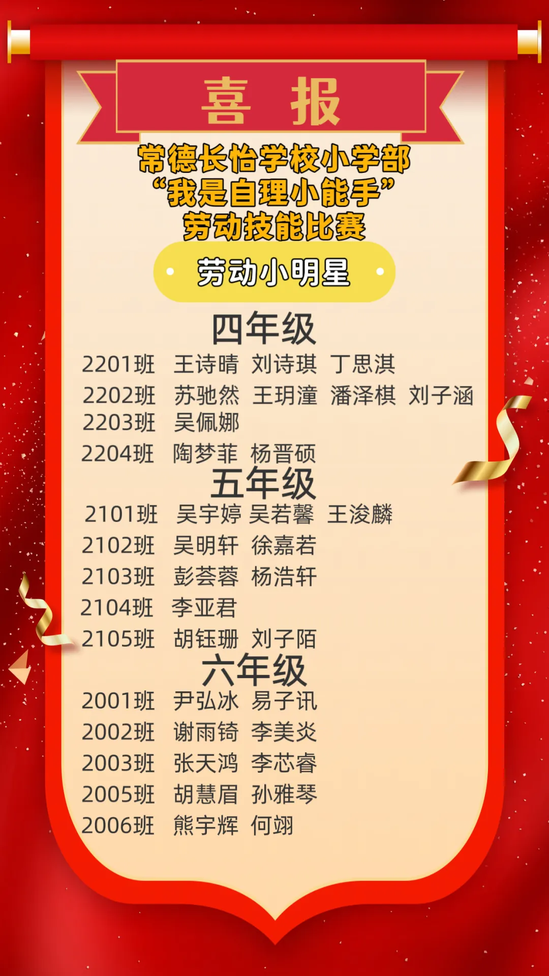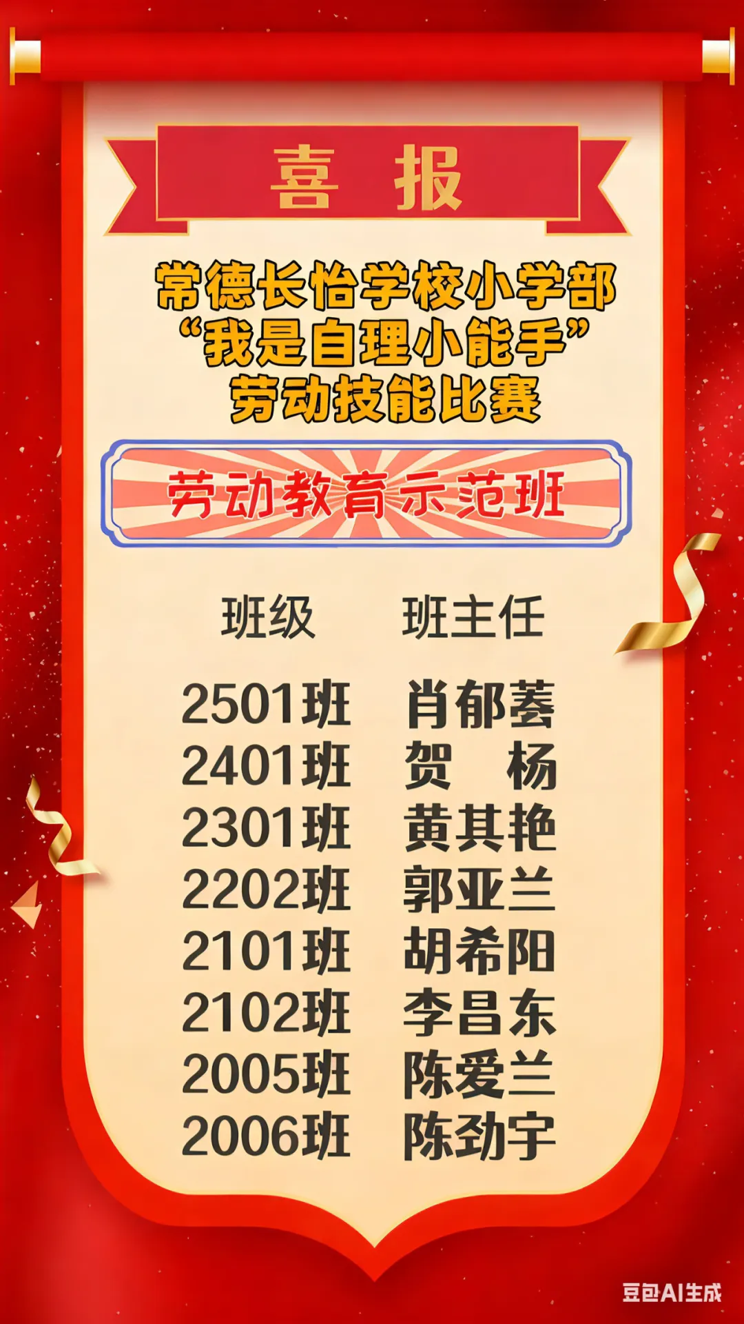 活动最终评选出8个“劳动教育示范班”,分别是一一班、二一班、三一班、四二班、五一班、五二班、六五班、六六班。此项活动每学期定期开展,已形成常态化惯例,有效培养了学生的劳动意识、自理能力与责任担当。