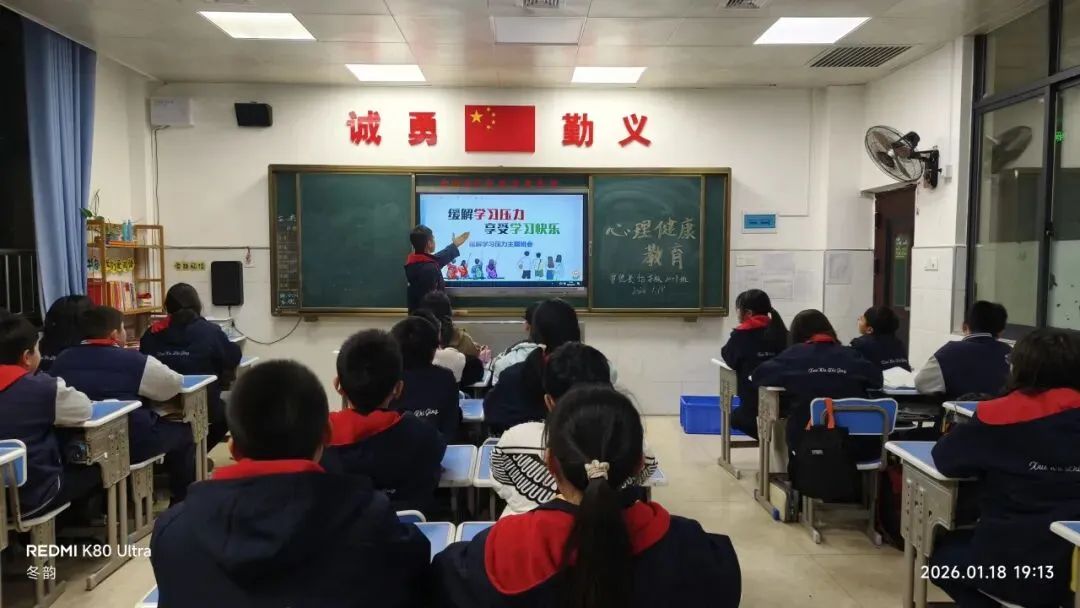 1月18日,各班开展《感受学习的乐趣》主题心理课,通过趣味互动、案例分享,帮助学生缓解期末焦虑与畏难情绪,培育积极向上的学习心态。