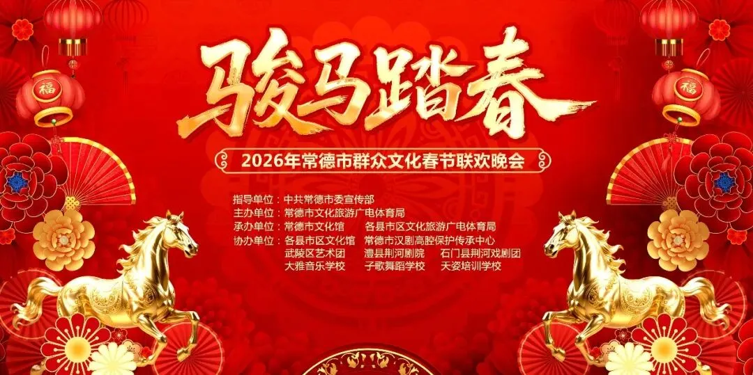 为弘扬社会主义核心价值观,展现常德市群众文艺发展成果,激发文艺创作热情,搭建相互交流的平台,提升群文队伍凝聚力,丰富广大群众的精神文化生活,营造欢乐祥和的节日氛围,在 2026 年春节来临之际,常德市文化馆将举办 “骏马踏春”——2026 年常德市群众文化春节联欢晚会。