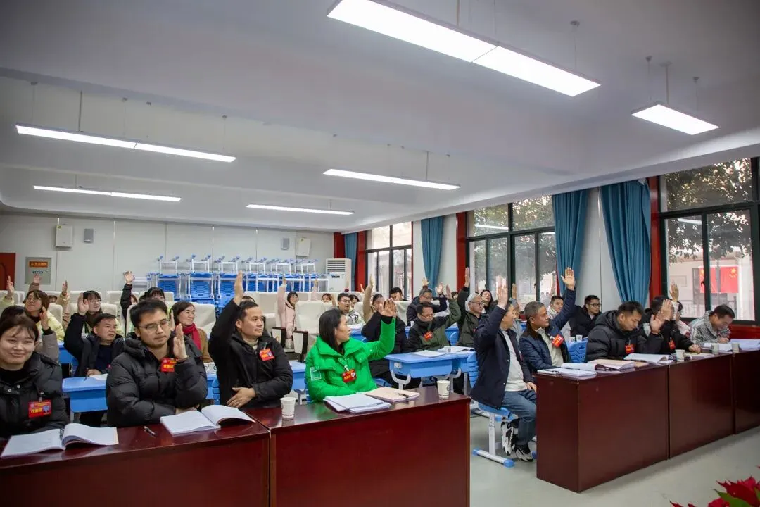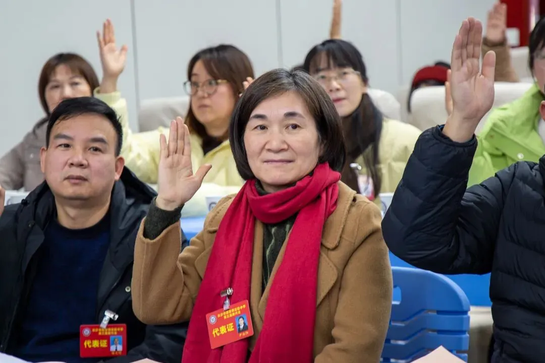 随后,大会进入选举与表决程序。通过无记名投票,李军同志当选为新一届工会主席,秦运金同志当选为工会副主席,选举过程公开、公正、规范。在举手表决环节,与会代表依次对《长沙市田家炳实验中学章程》《长沙市田家炳实验中学2026-2030五年发展规划》《长沙市田家炳实验中学中高级教师职称评审推荐工作方案》《长沙市田家炳实验中学校纪校规条例》《长沙市田家炳实验中学内控制度修改部分》五项重要议案进行了严肃认真的表决。每一项决议均由教师代表民主表决产生,体现了教代会在学校重大事项决策中的关键作用。