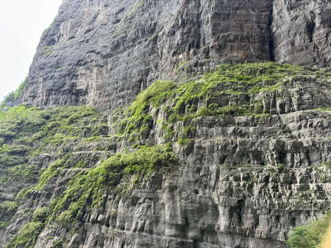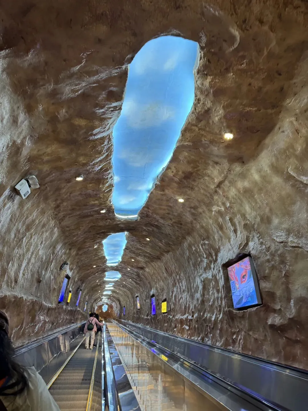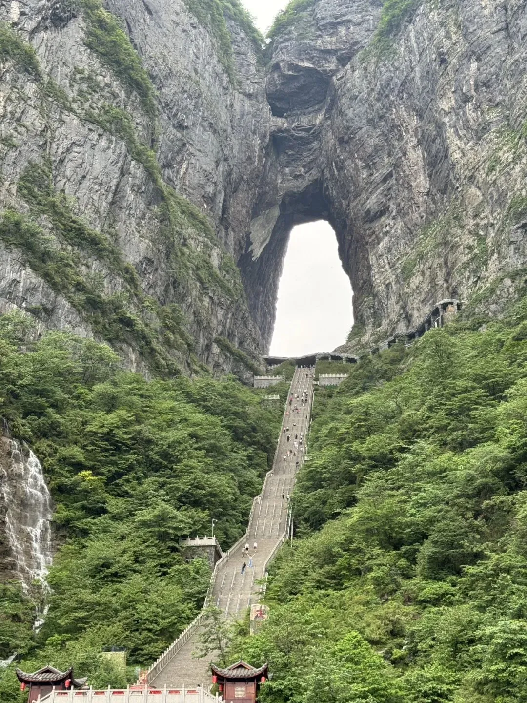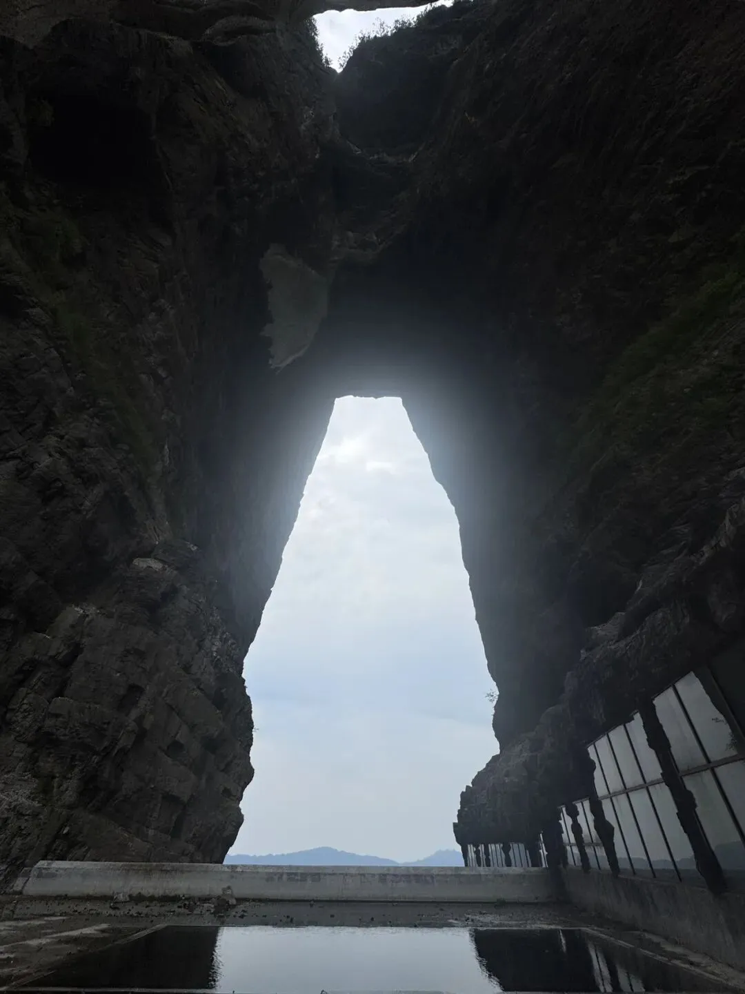 我觉得这个穿山电梯超级长啊,真的省了很多力,比较窄就能站一个人,猜想人多的时候可能很挤。坐完穿山电梯后就到了天门洞里,仰望这个山洞口,水滴从高处滴落,山石结理分明,如果不是人声鼎沸,好想在这里呆很久,就像要洞穿宇宙时空。天门洞是世界上最高的天然穿山溶洞之一,地质学家推测,它形成可能经历数百万年的地质演化,是典型的喀斯特地貌。