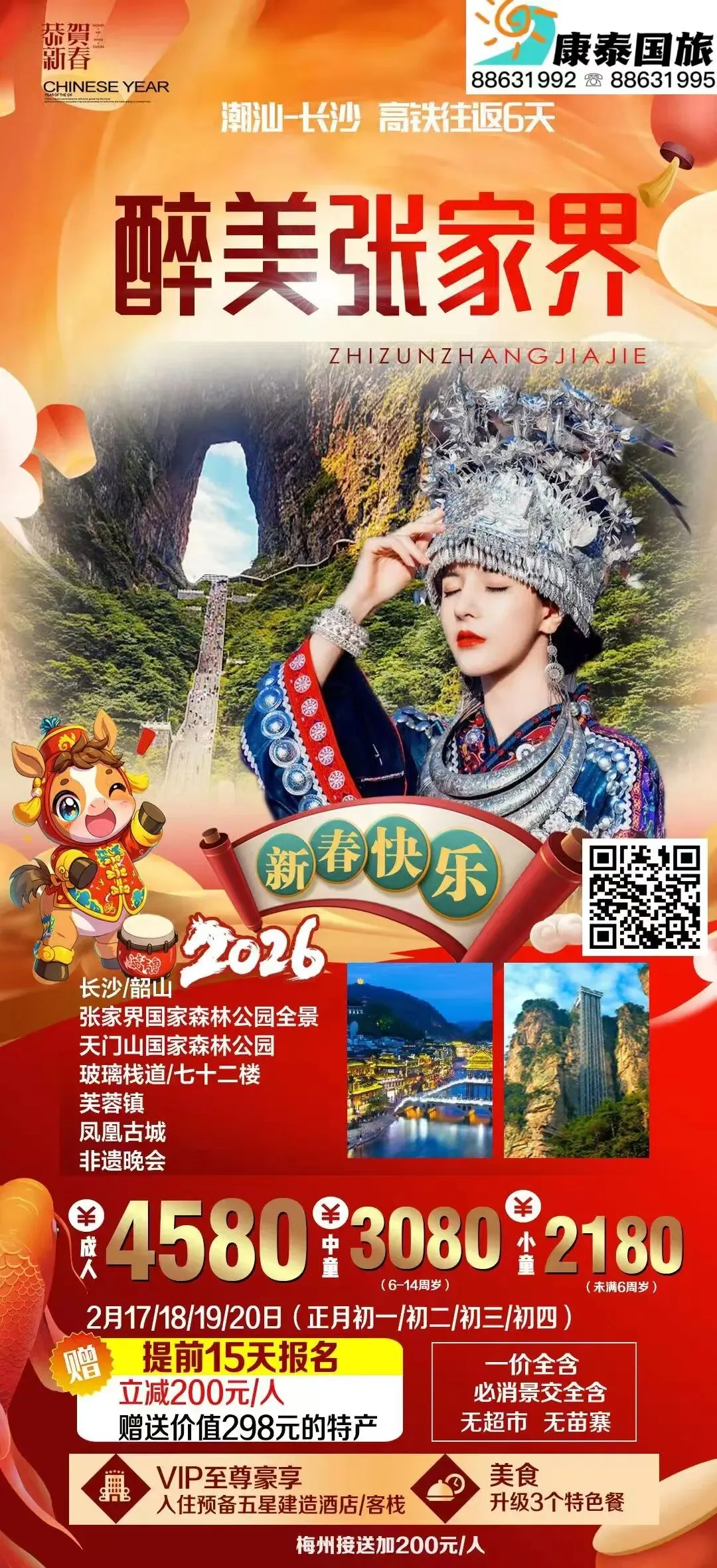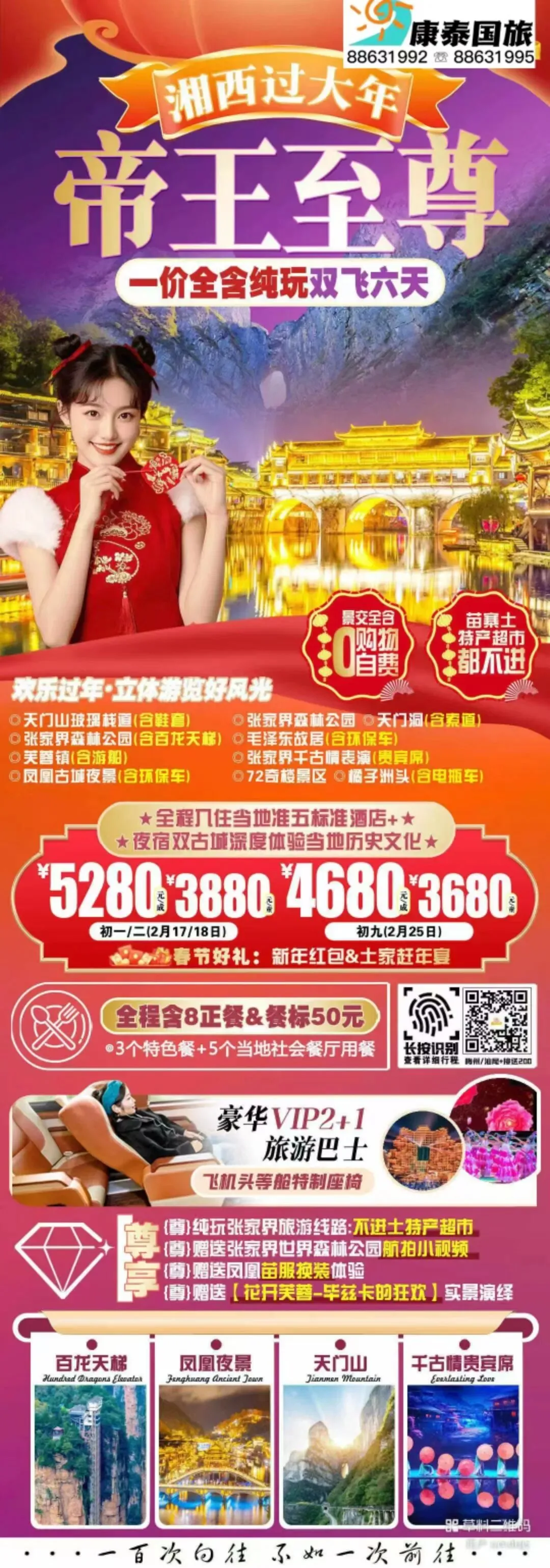 🌸 长沙➕韶山➕张家界森林公园➕百龙天梯➕天门山➕玻璃栈道➕通天索道➕芙蓉镇➕凤凰古城