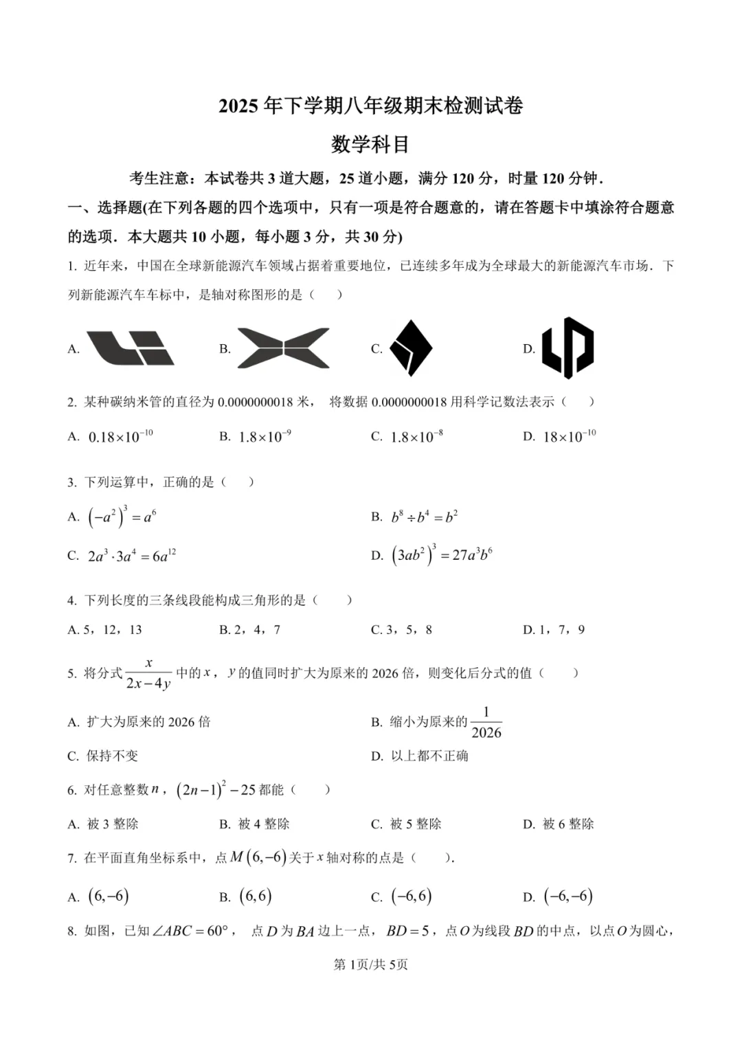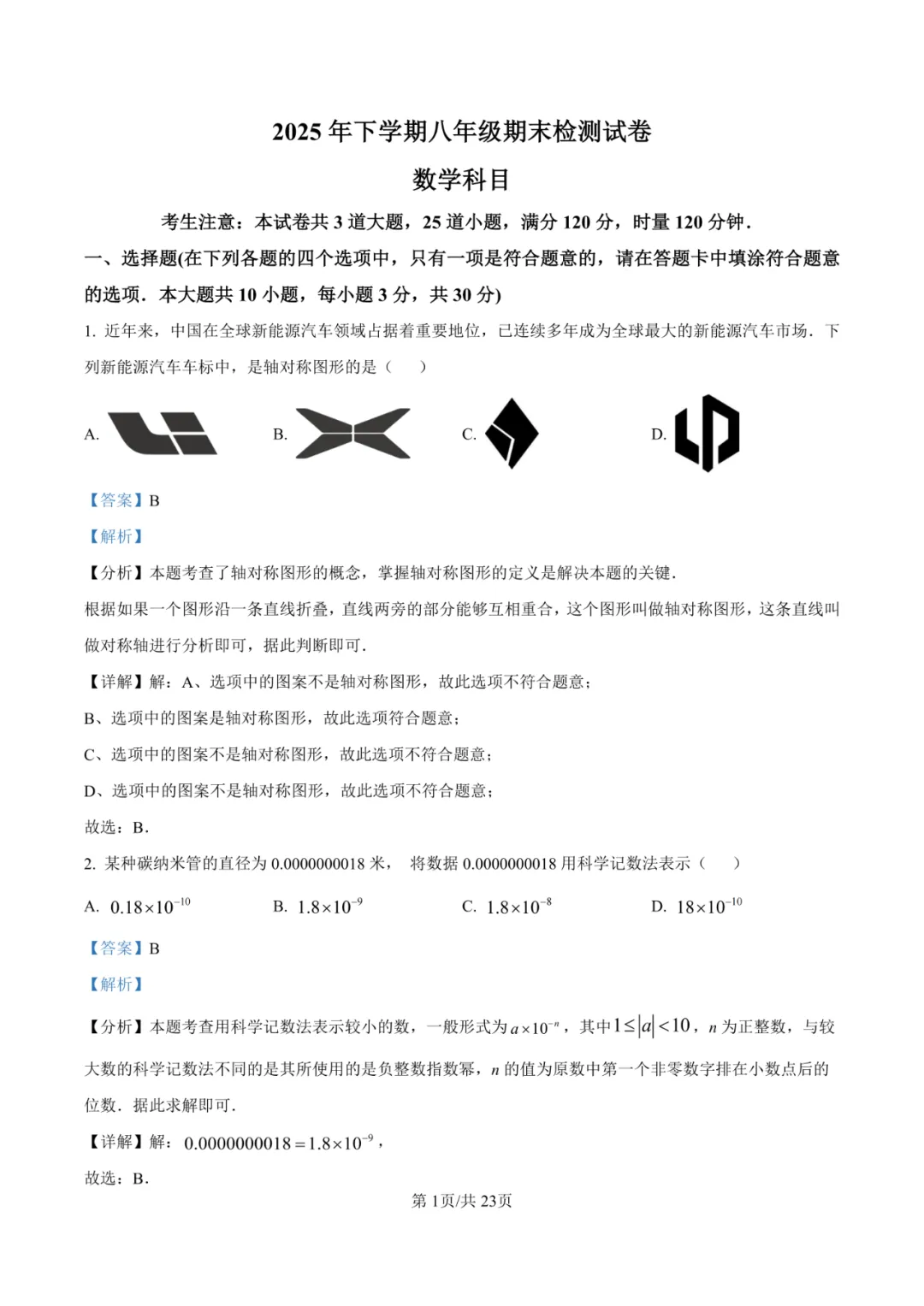 本卷严格遵循八年级数学课程标准,全面覆盖代数运算、几何证明、函数图像等核心内容。选择题注重基础概念考查,填空题突出计算能力,解答题通过等边三角形证明、和谐整式定义等创新题型考查逻辑推理能力。易得分题为科学记数法、轴对称图形识别等基础题;难点在于第10题几何综合证明和第25题动点问题分析,需要学生具备较强的空间想象和综合运用能力。试卷体现数学学科的逻辑性与创新性特点。