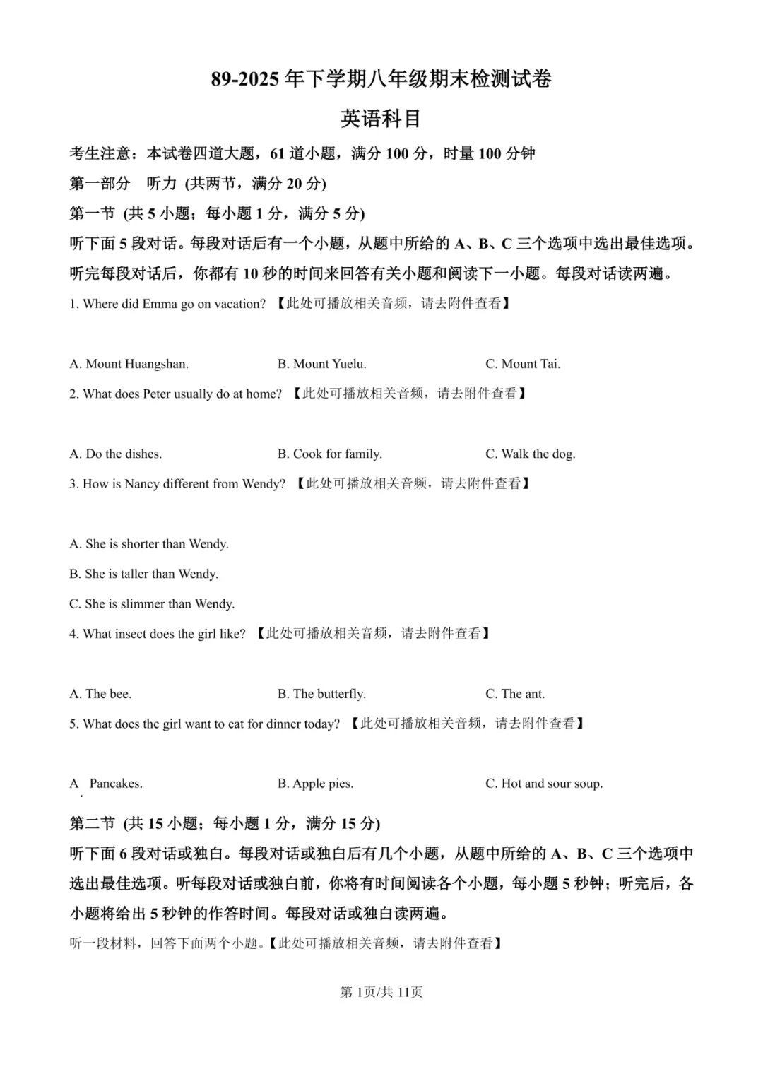 本卷严格遵循八年级英语课程标准,全面考查听力理解、阅读理解、语言运用和写作能力。听力部分涵盖日常生活对话,阅读选材包括海报信息、情感故事、科技说明文等,注重信息获取与推理判断。易得分题为直接信息匹配和基础语法填空;难点在于完形填空的情感理解题和阅读推理题,如第26题人物情感变化分析和第45题生活哲理理解,需要学生具备较强的语篇理解和逻辑思维能力。写作题设计具有实践指导意义,体现英语学科的工具性与人文性。