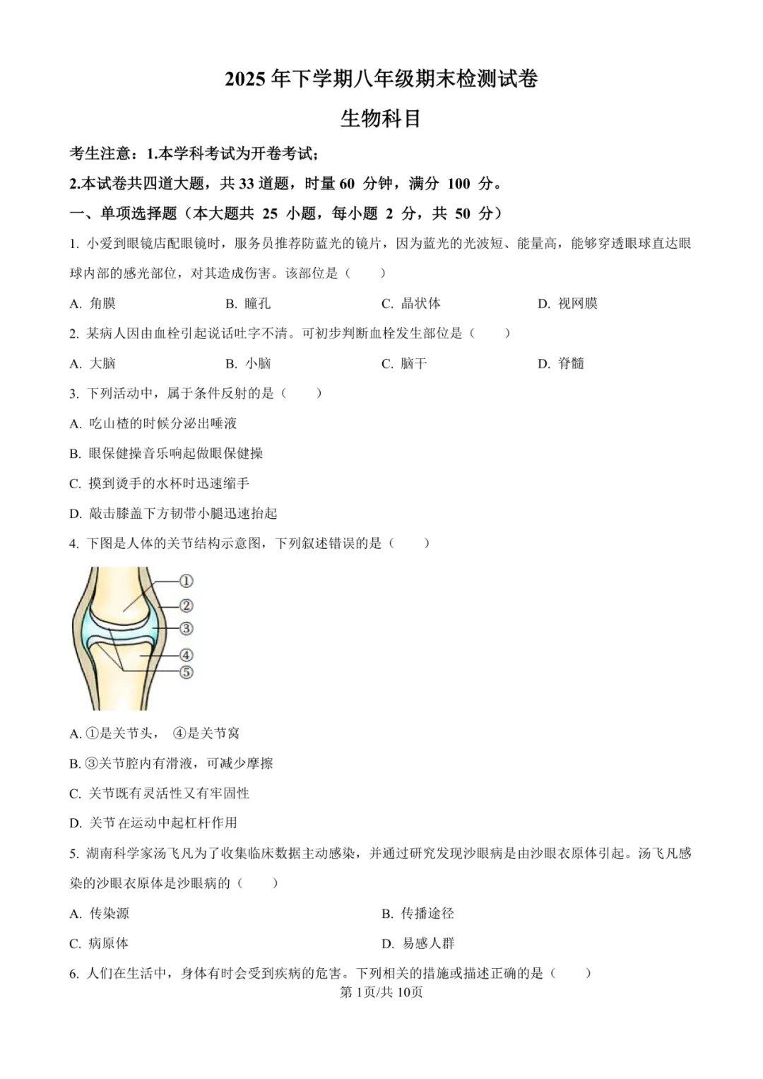 本卷严格遵循八年级生物课程标准,全面覆盖人体生理、遗传进化、生态系统等核心内容。选择题注重基础概念考查,非选择题通过耳结构图、果蝇遗传实验等图文材料考查综合分析能力。易得分题为基础知识判断题;难点在于实验设计分析和遗传概率计算,如第30题酸雨实验设计和第33题果蝇遗传分析,需要学生具备较强的科学探究和逻辑推理能力。试卷突出生物学科的实验性与应用性特点。
