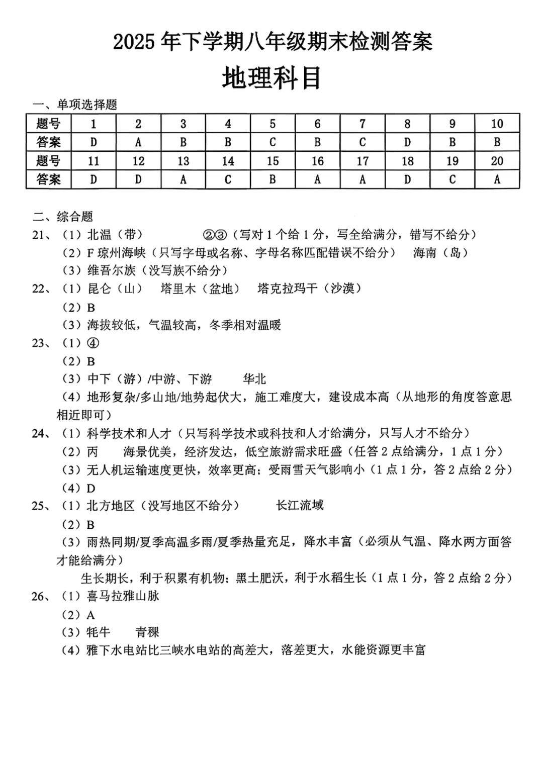 本卷严格遵循八年级地理课程标准,全面覆盖中国地理、世界地理核心内容,突出人地协调观和区域认知素养。选择题以花江峡谷大桥、海南自贸港、雅西高速等国家工程为载体,综合题通过足球邀请赛、天山隧道、西气东输等案例考查综合分析能力。易得分题为基础识图与概念判断;难点在于第22题地形对气候影响分析和第26题水电站对比分析,需要学生具备较强的材料解读和逻辑论证能力。试卷体现地理学科的综合性与实践性特点。