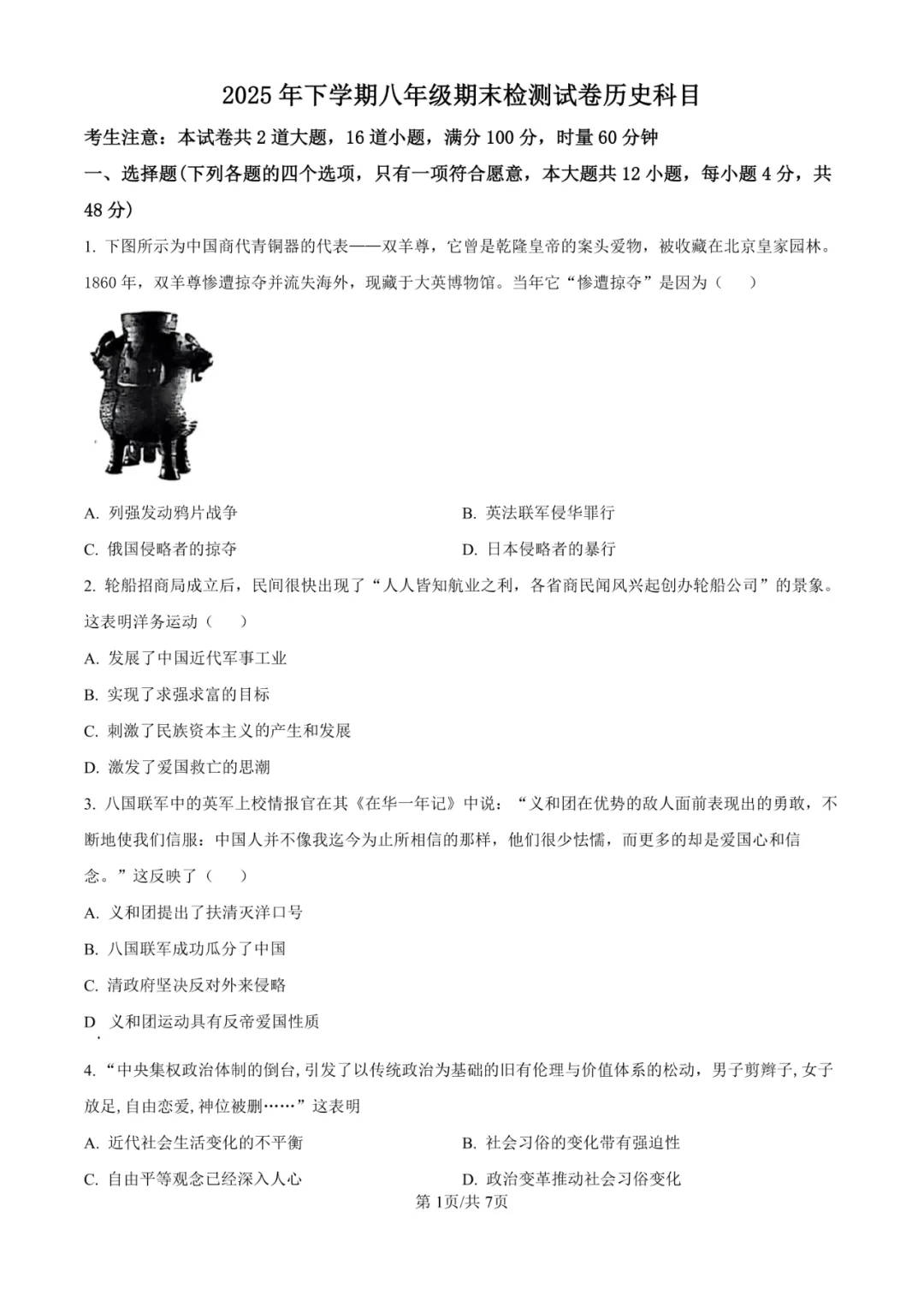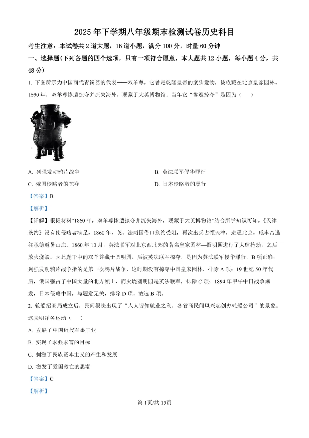 本卷严格遵循八年级历史课程标准,全面覆盖中国近代史核心内容,从鸦片战争到解放战争,重点考查重大历史事件、人物及其影响。选择题注重基础史实识记,非选择题通过材料分析、图片解读等形式考查历史解释与论证能力。易得分题为时间线索清晰的基础知识题;难点在于材料解读与史论结合题目,如第15题长征意义分析和第16题青年运动意义阐述,需要学生具备较强的历史思维和材料分析能力。试卷突出历史学科的思想性与教育性。