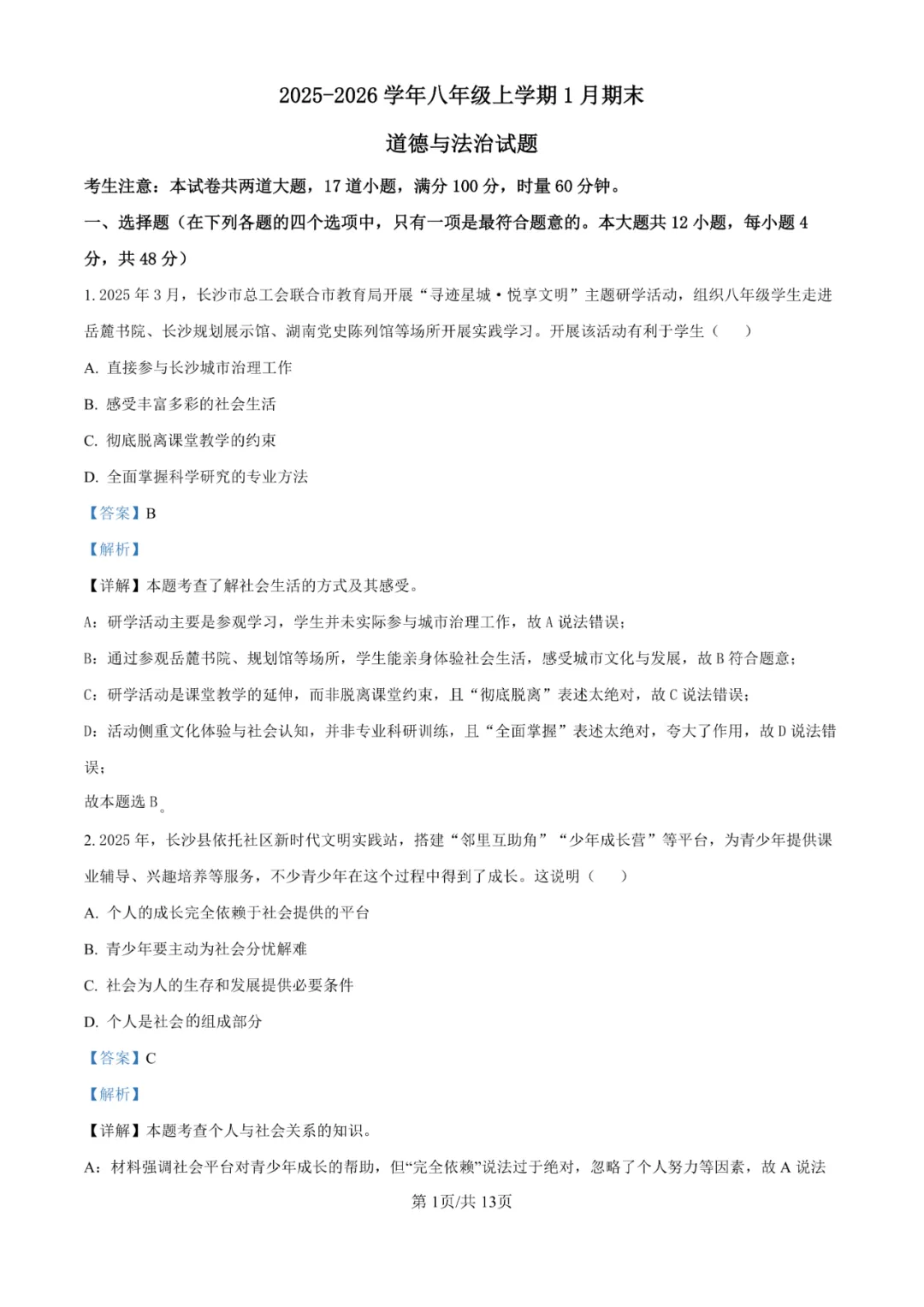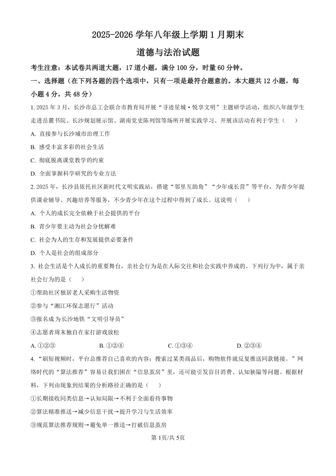 本卷紧扣八年级道德与法治课程标准,全面覆盖社会责任、法治意识、国家安全等核心内容。选择题以长沙研学、湘超联赛、AI技术等现实情境为载体,非选择题通过国防教育、网络安全等主题考查价值判断与实践能力。易得分题为生活常识与基础概念判断;难点在于第16题观点评析和第17题实践计划制定,需要学生具备较强的价值辨析和逻辑论证能力。试卷突出德育课程的实践性与思想性。