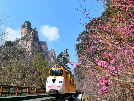 “本来以为刚过完寒潮会很冷,没想到天气这么好,梅花也开得这么旺!” 来自长沙的游客张女士笑着说,“乘上萌趣的观光小火车,目光所及皆是盛放的梅花。十里画廊的峰林配上梅花,就像走进了一幅山水画里。”