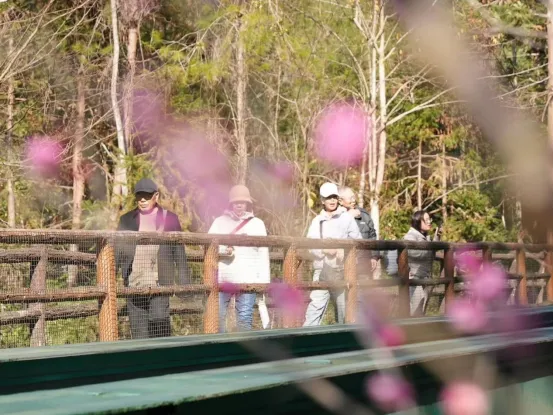 观光电车轨道上,造型可爱的“生肖小火车” 穿梭在花海与峰林间。黑黄相间的 “旺财号”、橙色的“义虎号”与粉色的梅花相映成趣,成为游客镜头里的绝佳搭配。不少游客选择徒步漫游,在梅花树下驻足拍照,用镜头定格这份春日限定的浪漫。