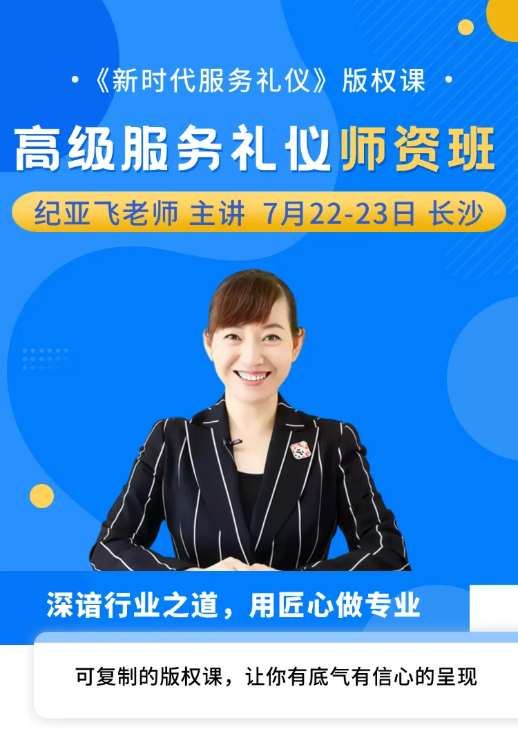 长沙开班 || 纪亚飞老师主讲7月22日-23日高级服务礼仪师资培训班