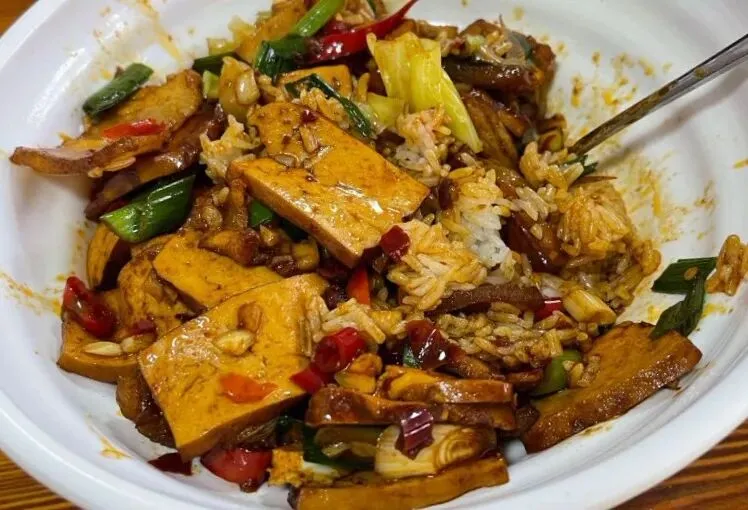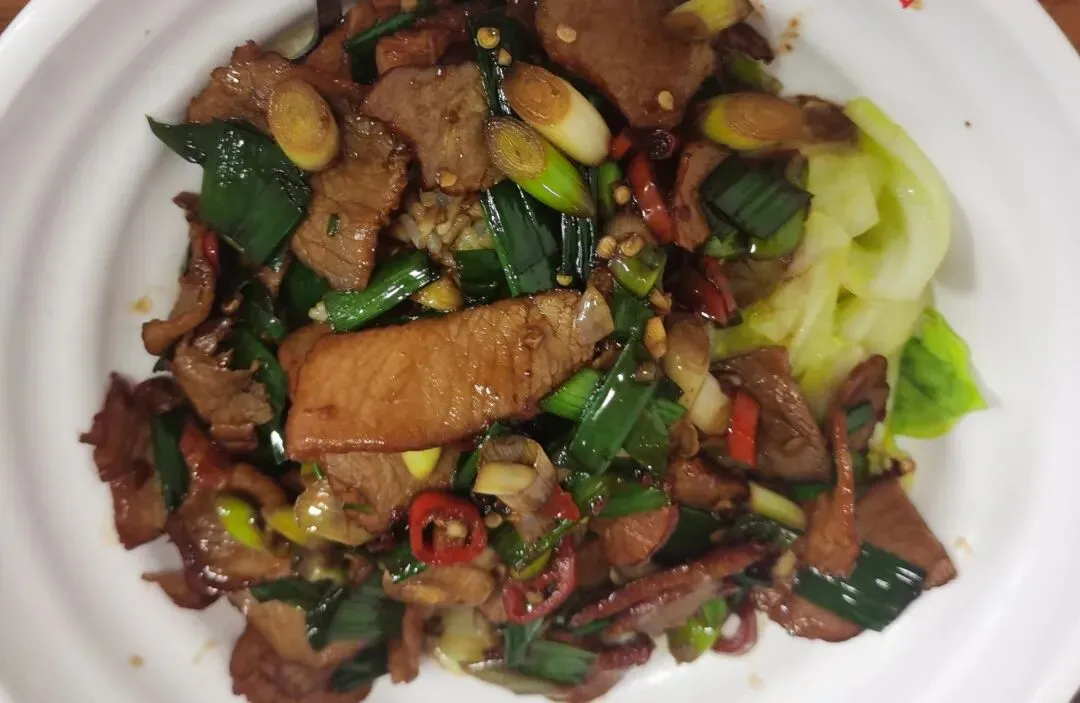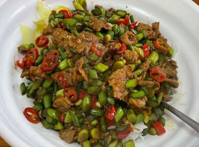 孜然牛肉盖码饭,就盖码饭来说,牛肉份量算多的,牛肉不错,蒜苗丁也炒得入味,没有生味也没有塑料味,蛮喜欢这个。青辣椒瘦肉条,也试了一点,又香又起口味,个人感觉要是淡点会更好,可能是我本身口味偏淡咯。朋友点的香干回锅肉,说好吃,有汤拌饭也很爽,但是我试了一片香干,感觉不晓得是因为豆瓣还是生抽的缘故,有点点带甜味,但是朋友口味重,感觉不出来,哈哈。黄瓜炒猪肝,我不吃猪肝的,所以没试味,但是看这个黄瓜片显得还蛮下饭一样……反正这道菜也是他们家好多人点的,挺受欢迎。怕饭里油多的,建议要求“过桥”(就是饭和菜分开装,不直接把菜扣在饭上。)有一说一,比较是盖码饭,快餐类,当然不会像私房菜和土菜馆的味道那么讲究,但是他出圈还是有一定道理的,干净、菜品丰富、现炒有锅气、调味下饭,让人吃得开心。