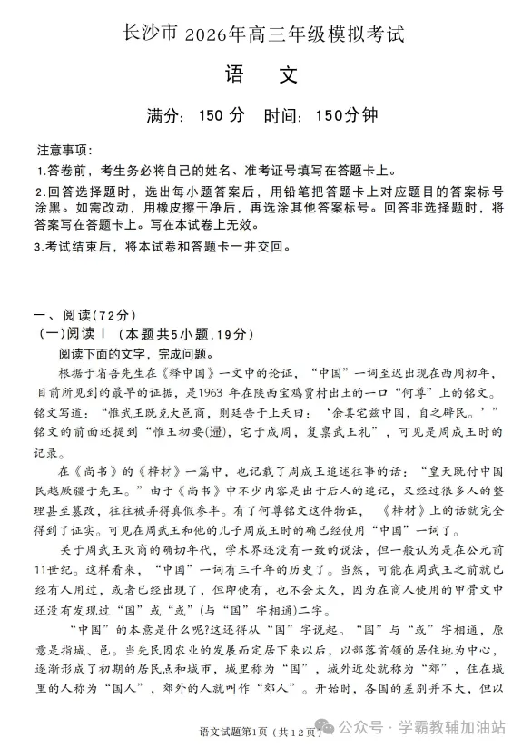 长沙市2026年高三年级模拟考试【语文数学完整版答案pdf电子版】