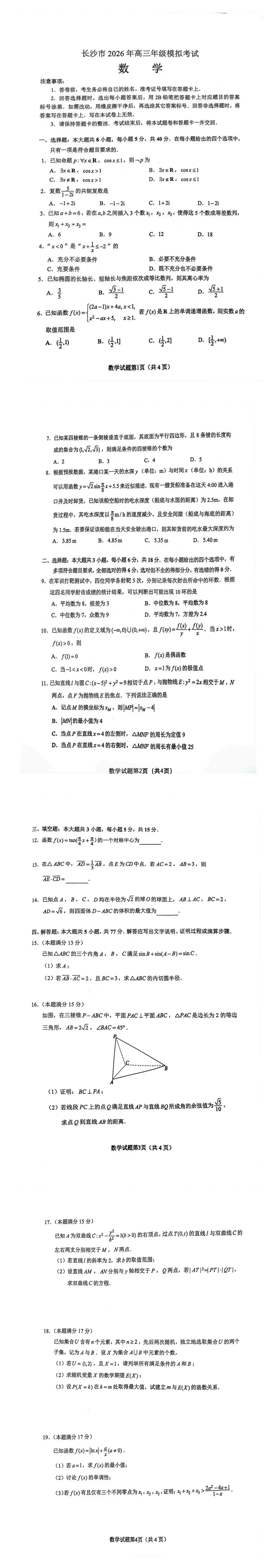 >长沙市2026届高三适应性考试