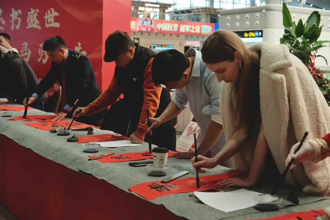 除了赠送春联,书法家们还与旅客互动交流,讲解春联文化、书法知识,不少旅客兴致勃勃地尝试提笔书写,现场俨然成为生动的传统文化实践课堂,浓浓年味弥漫整个候车大厅。长沙高铁南站工作人员介绍,春运期间车日均客流量超过十多万人次,举办这样的文化活动,既能缓解旅客候车时的匆忙情绪,又能传播传统文化,营造温馨和谐的出行环境。