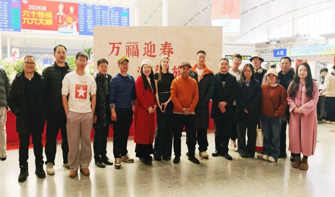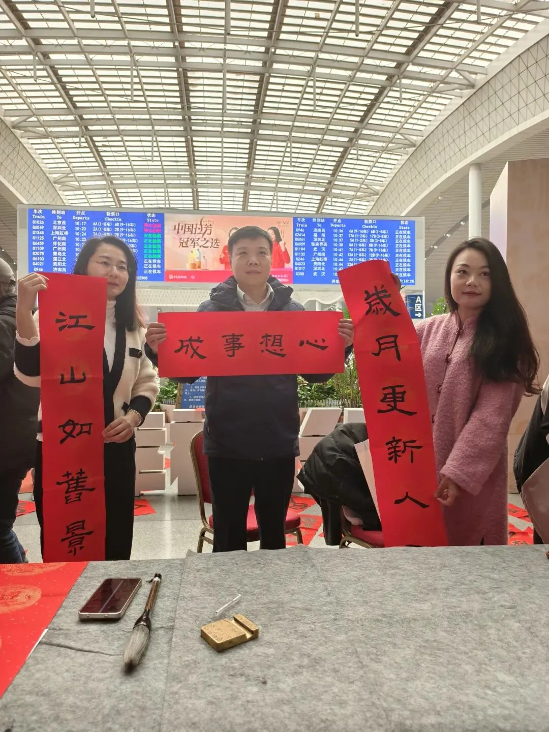2月2日上午9点,湖南省文化馆、长沙市文艺评论家协会与长沙高铁南站联合举办现场写春联活动,长沙市文艺评论家协会主席曹隽平带队,李国强、曾祥頔、陈文莽、杨兰君以及云南大学书法研究曹骞帆等6位书法家现场挥毫,为往来旅客送上饱含温度的新春祝福,让匆忙的归途浸润传统文化馨香。