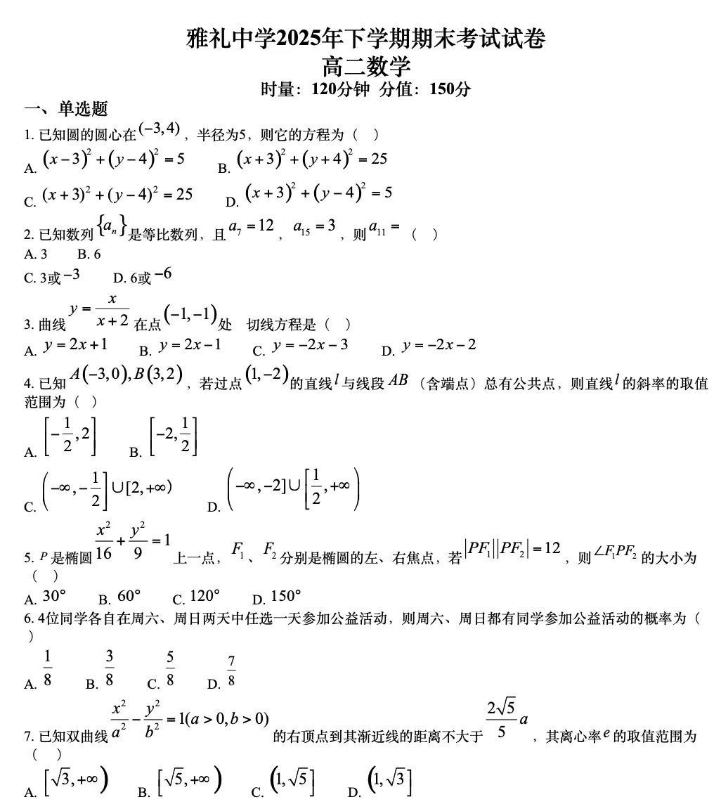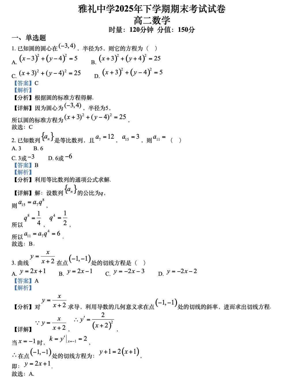 点击关注,后台发送信息【湖南省长沙市雅礼中学2025-2026学年高二上学期期末数学试题】领完整word版试卷+答案解析!
