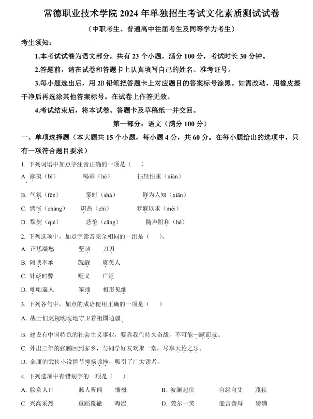 >2024年常德职业技术学院单招考试文化素质测试试卷及答案