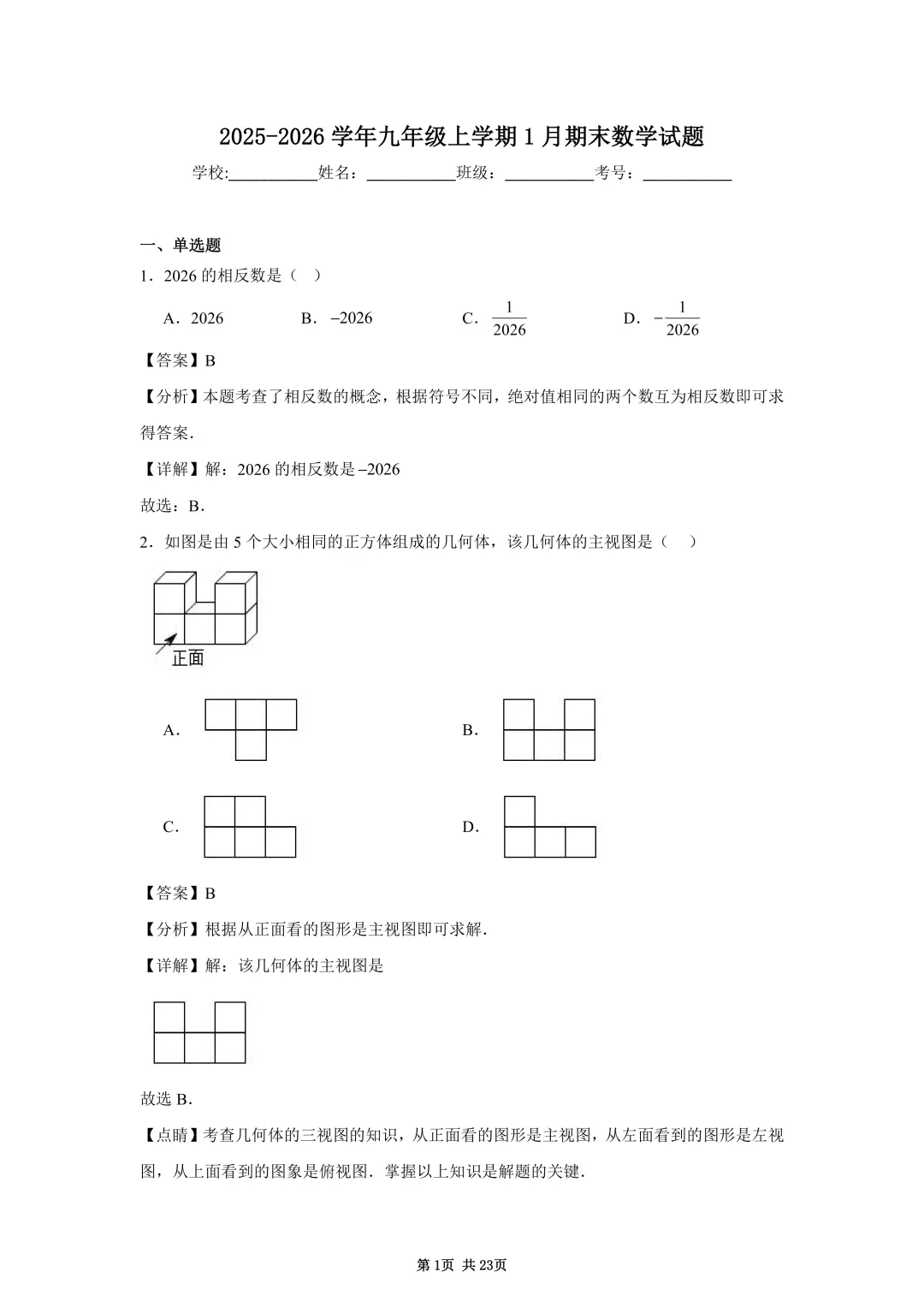 >2025-2026学年湖南省长沙市雅礼教育集团九年级(上)期末数学试卷含解析(教师版)