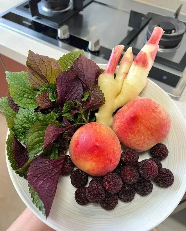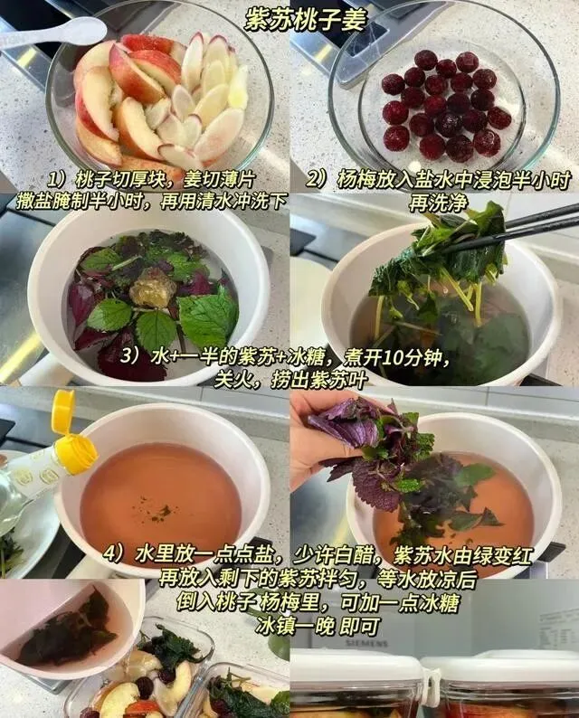 紫苏能去寒去湿 , 嫩姜健脾开胃 , 桃子杨梅本身就酸甜解腻 , 这几样凑一起 , 既是小零食 , 又是养生方。