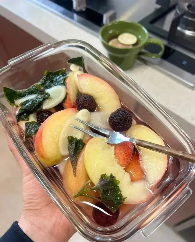 朋友从冰箱端出来的时候 , 我满脸嫌弃 , 心想这啥玩意儿啊 , 桃子杨梅配姜片 , 还撒一堆紫苏叶 , 像是吃不完怕浪费随便凑一块腌的...