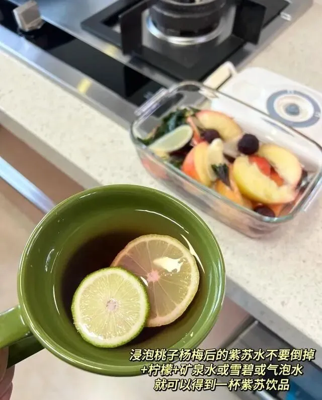 加两片柠檬 , 倒一瓶气泡水进去 , 秒变紫苏特调。