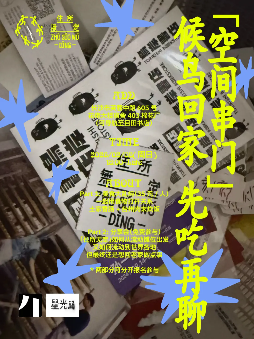 「住所无定」是一个在湖南慈利的酒吧,也是一个松散的聚合体,我们习惯流动,在不同的地方里观察、玩耍,顺便创造。