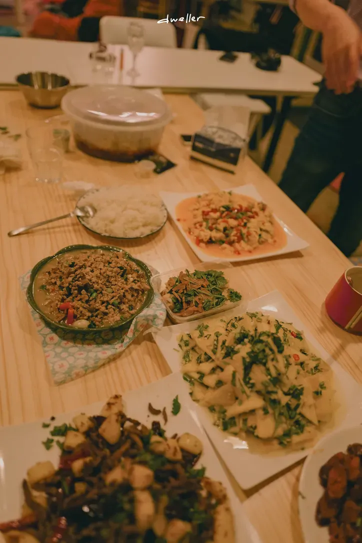 2025年春天,西早和狗毛在上海共居空间dweller的家庭聚会上做了这两道菜。左上是肉末炊饭,右下角落是土家香肠。