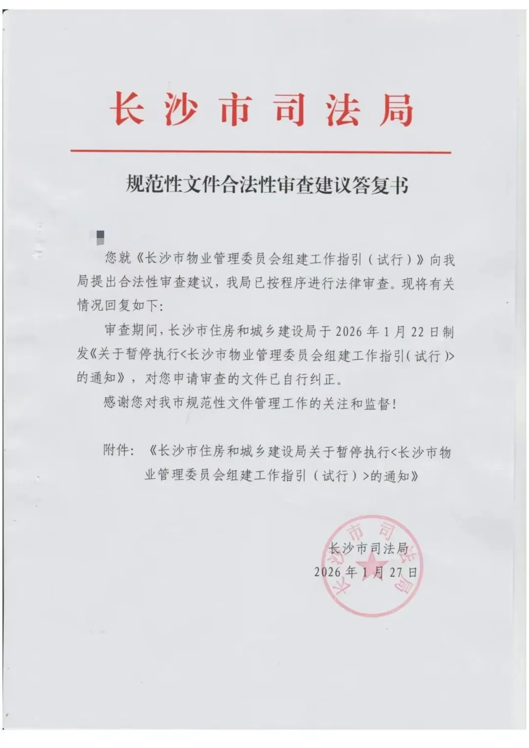 2026年初:有市民或组织向长沙市司法局提交审查建议,质疑该文件涉嫌超越法定权限、干预业主自治权。