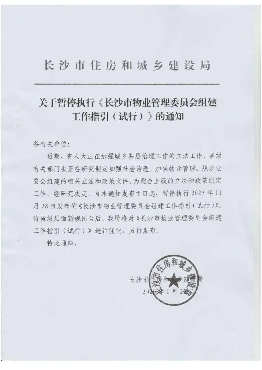 2026年1月22日:长沙市住建局紧急发布通知,暂停执行《指引》,理由是“配合省级立法进程”。
