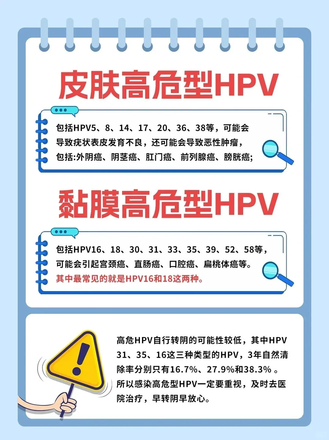 黏膜高危型HPV以HPV16、18、30、31、33、35、39、52、58等为代表(数据源于权威医学数据库),其中HPV16和18型最为常见。它们主要侵袭宫颈、直肠、口腔、扁桃体等黏膜部位,是宫颈癌、直肠癌、口腔癌、扁桃体癌的重要诱因。临床统计显示,约90%的宫颈癌检出与HPV16/18感染相关(数据来源:《中华妇产科学》)。二、高危HPV自行转阴率低,拖延易拖成隐患