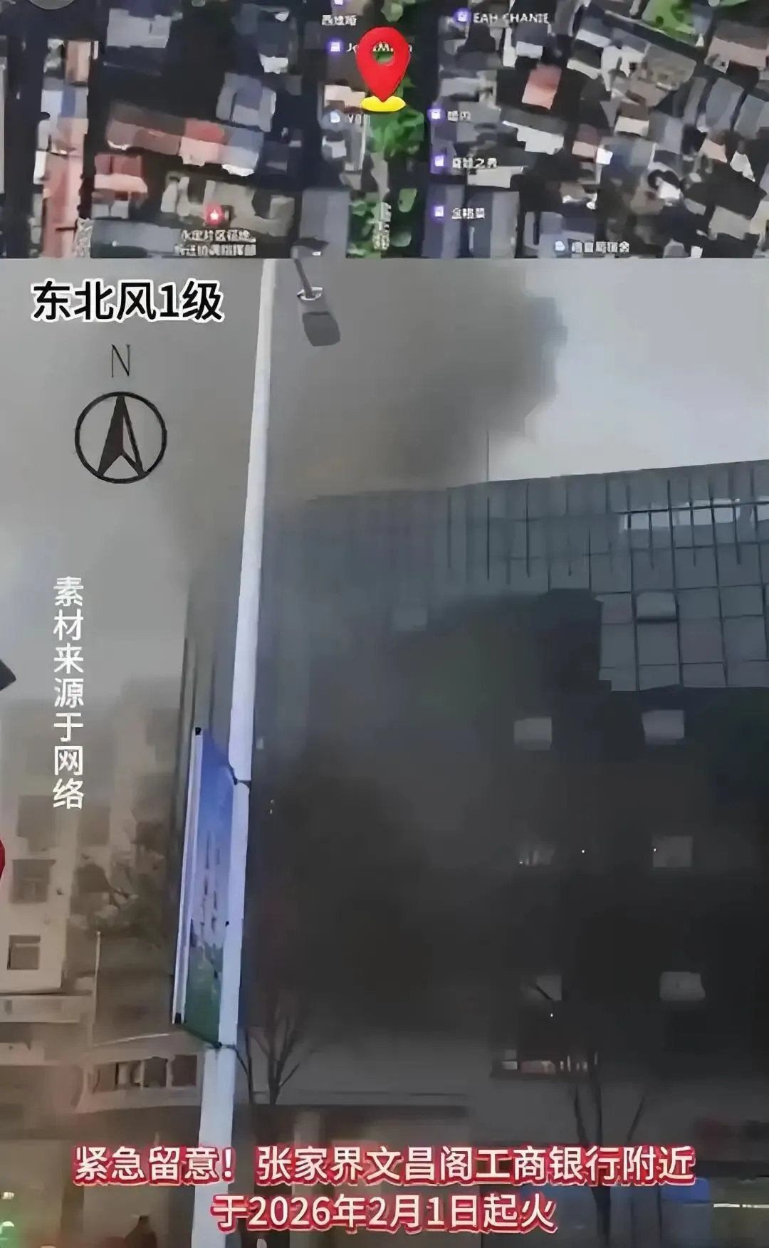 2月1日下午,网友发布视频称,湖南省张家界市区发生火情,着火的具体位置在一家银行附近。