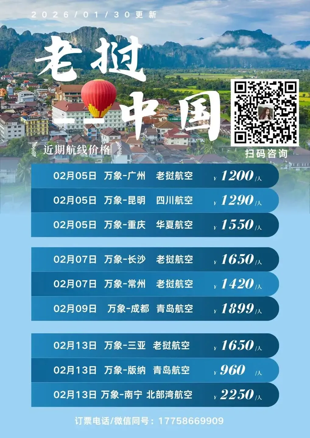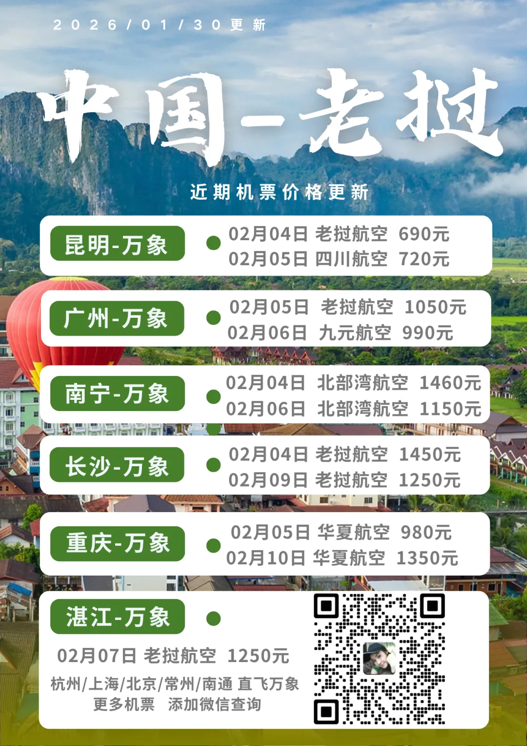 >2月中老特价机票:7日万象-长沙1650元/人;7日湛江-万象1250元/人