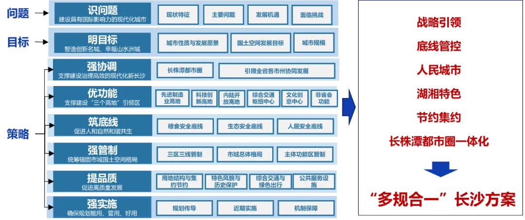 《规划》以习近平新时代中国特色社会主义思想为指导,贯彻习近平总书记关于国土空间规划的重要论述和考察湖南讲话精神,按照自然资源部关于市级国土空间总体规划编制要求,在充分落实全国国土空间规划纲要、省级国土空间规划等要求的基础上,按照“问题-目标-策略”的规划逻辑,突出战略引领、底线管控、人民城市、湖湘特色、节约集约、多规合一的规划导向,形成“多规合一”的长沙方案。