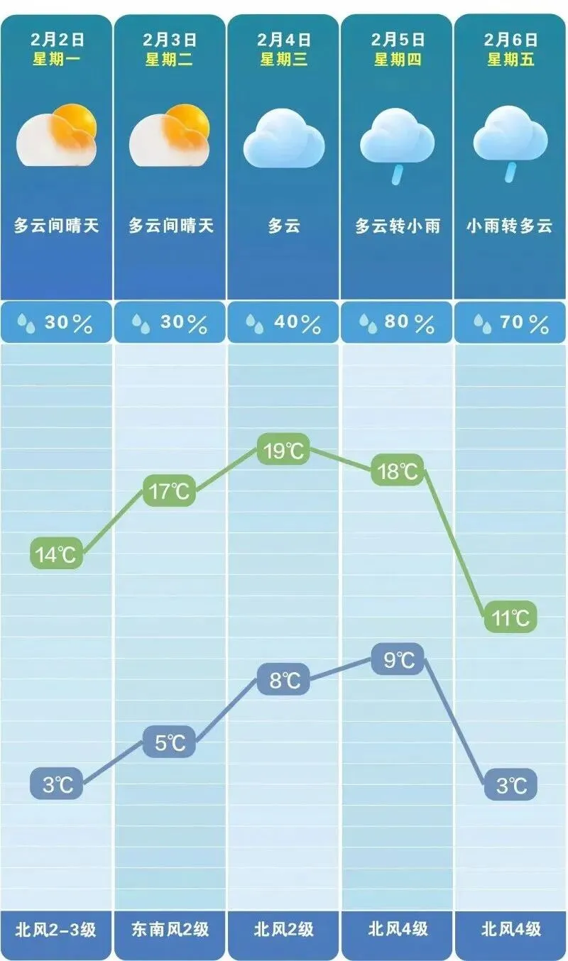 2日多云间晴天,阳光如薄纱轻柔覆盖全城,最高气温14℃,最低气温3℃,北风2到3级,带着初春的清爽