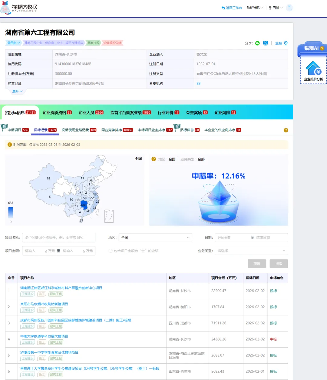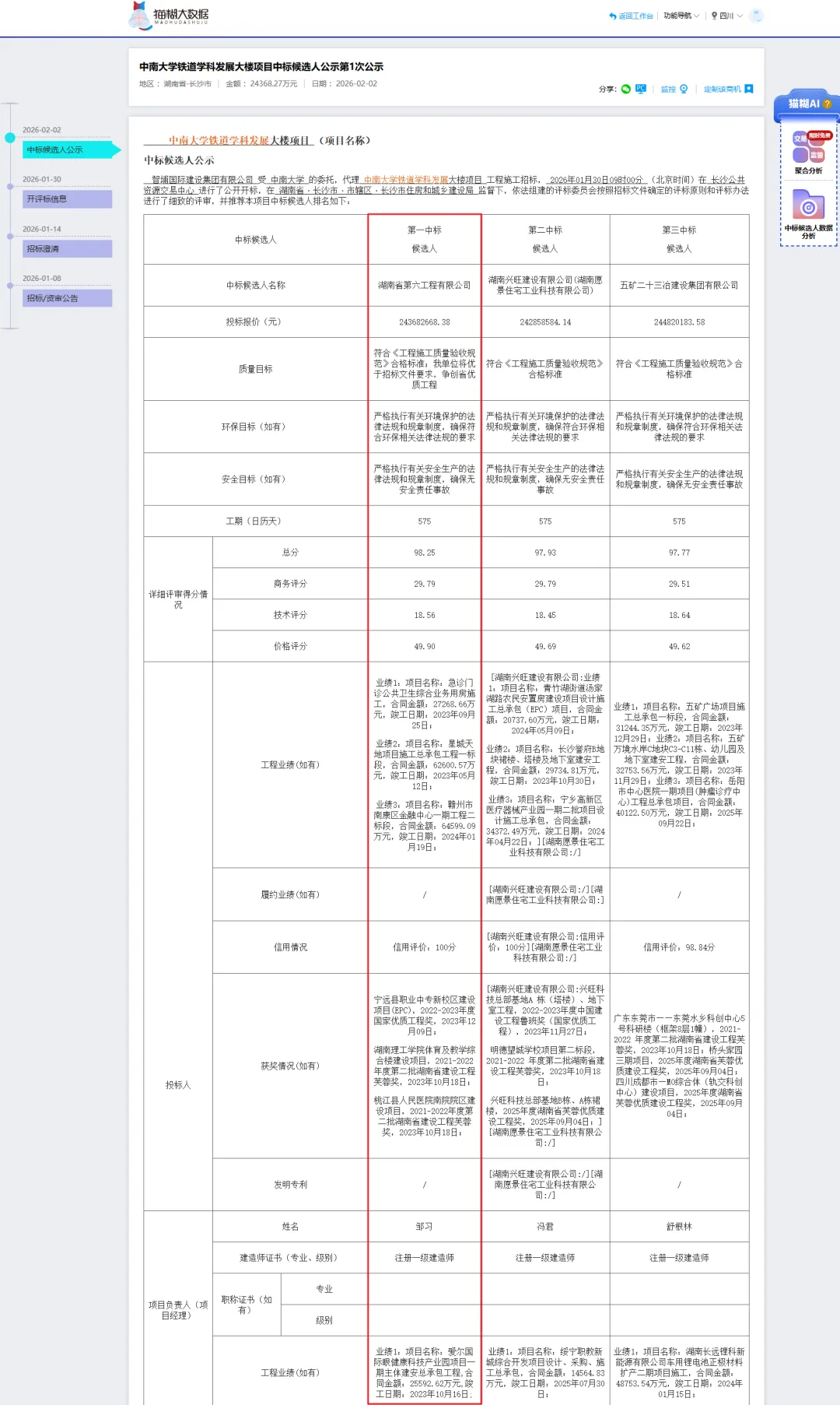 2026年2月2日,中南大学铁道学科发展大楼项目中标候选人公示第1次公示。该项目位于湖南省长沙市天心区中南大学天心校区,总建筑面积为64592.11平方米,其中地上建筑面积为53988.46平方米,地下建筑面积为10603.65平方米。项目建筑地上13层,地下1层,总高度57.8米,最大跨度18米,采用桩基础形式,结构体系为框架-剪力墙结构。主要建设内容包括科研用房、实验实习用房、教室、办公用房、设备用房及人防地下车库等。项目总投资金额为2.7713亿元,绿色建筑等级为绿色二星,采用装配式建筑建造和绿色施工管理模式,绿色建材应用比例为80%,装配率50%。该项目于2026年1月30日正式开标,共有40家投标人参与投标。最终由湖南省第六工程有限公司以2.4368亿元成功中标。项目计划工期为575天,计划开工日期为2026年2月28日,计划合同完工日期为2027年9月26日。如果您想了解该中标人的招投标经营状况,可以通过猫糊平台的“企业查询”来查看该企业在过去两年内全国各地的投标记录。*本文源于各级政府公共资源交易网站,项目后期或有更正调整,请以最新公告为准!
