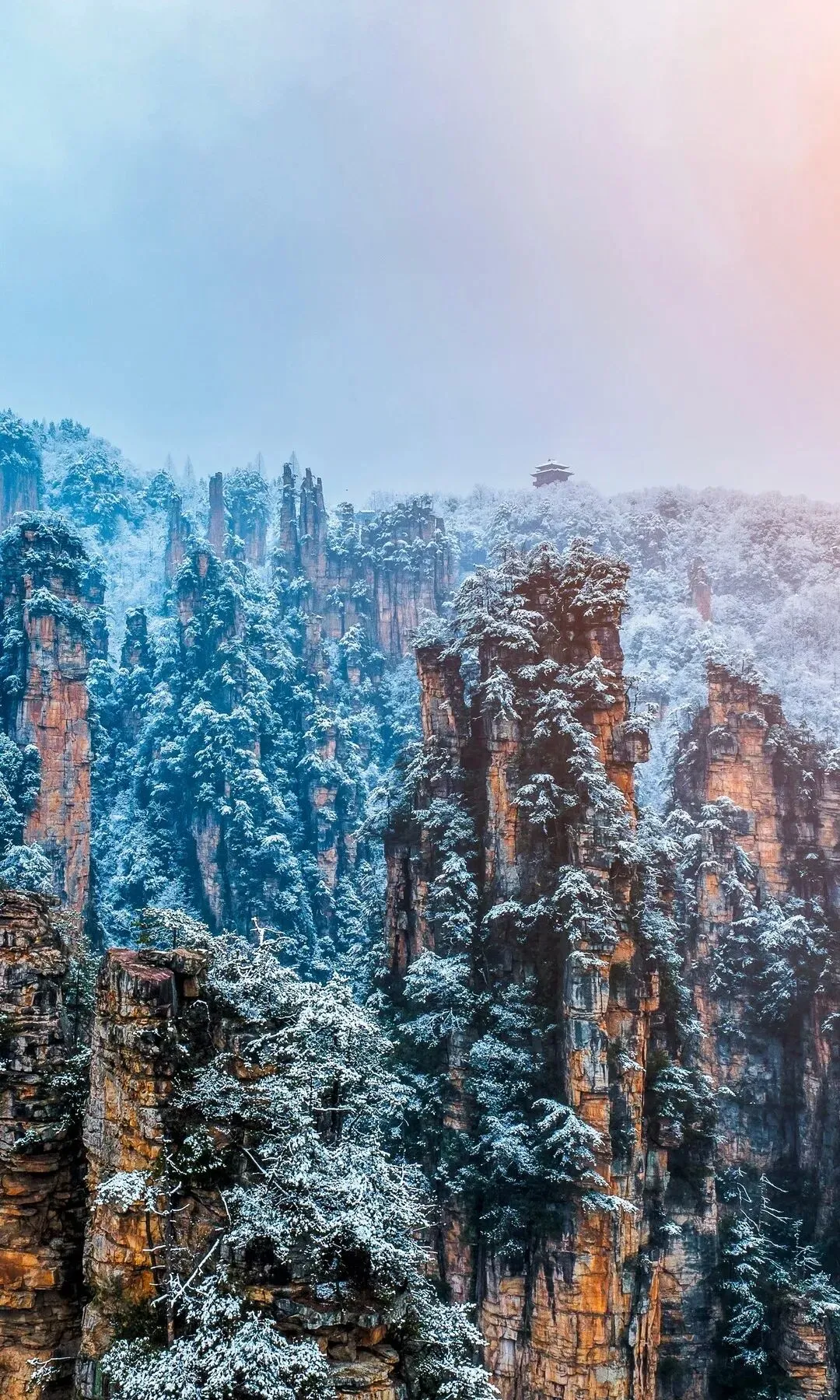 这里是《阿凡达》取景地的原型所在。冬季清晨,雾凇包裹着每一根石柱,在晨光中闪烁着钻石般的光芒,仿佛进入了潘多拉星球。