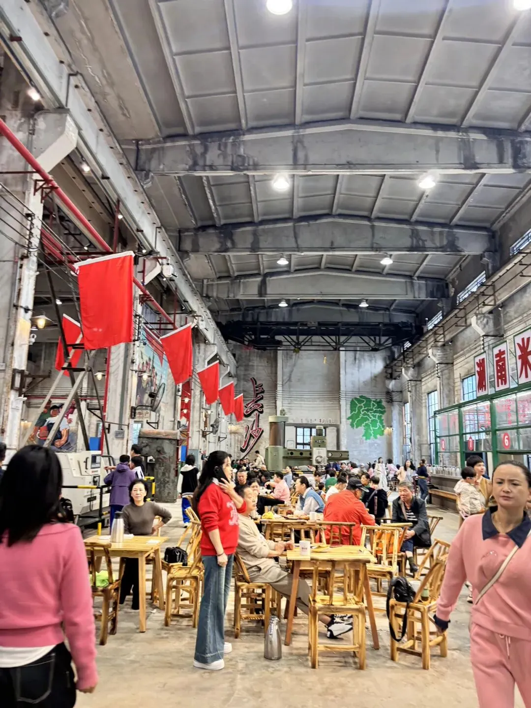 车子慢悠悠绕过巷子,直接停进厂房的院子里,穿过院子走进对面的大厂房,瞬间就被扑面而来的人气裹住——热闹,却又带着老长沙的亲切。大门口立着一台旧机械,金属外壳带着岁月的质感,默默诉说着曾经的拼搏年代,一脚踏进来,仿佛就触到了时光的余温。