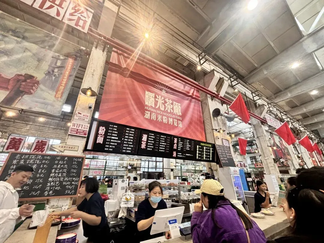 厂房里木桌木椅坐得满满当当,本地的爹爹娭毑捧着茶杯慢悠悠唠嗑,年轻人举着手机拍墙上的复古标语,拖家带口的我们找了张空位坐下,瞬间就融进了这股鲜活的市井气息里。